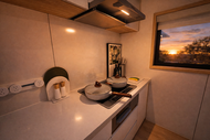 Fully equipped kitchen with stove and oven, premium range hood, quartz countertops, and custom cabinetry